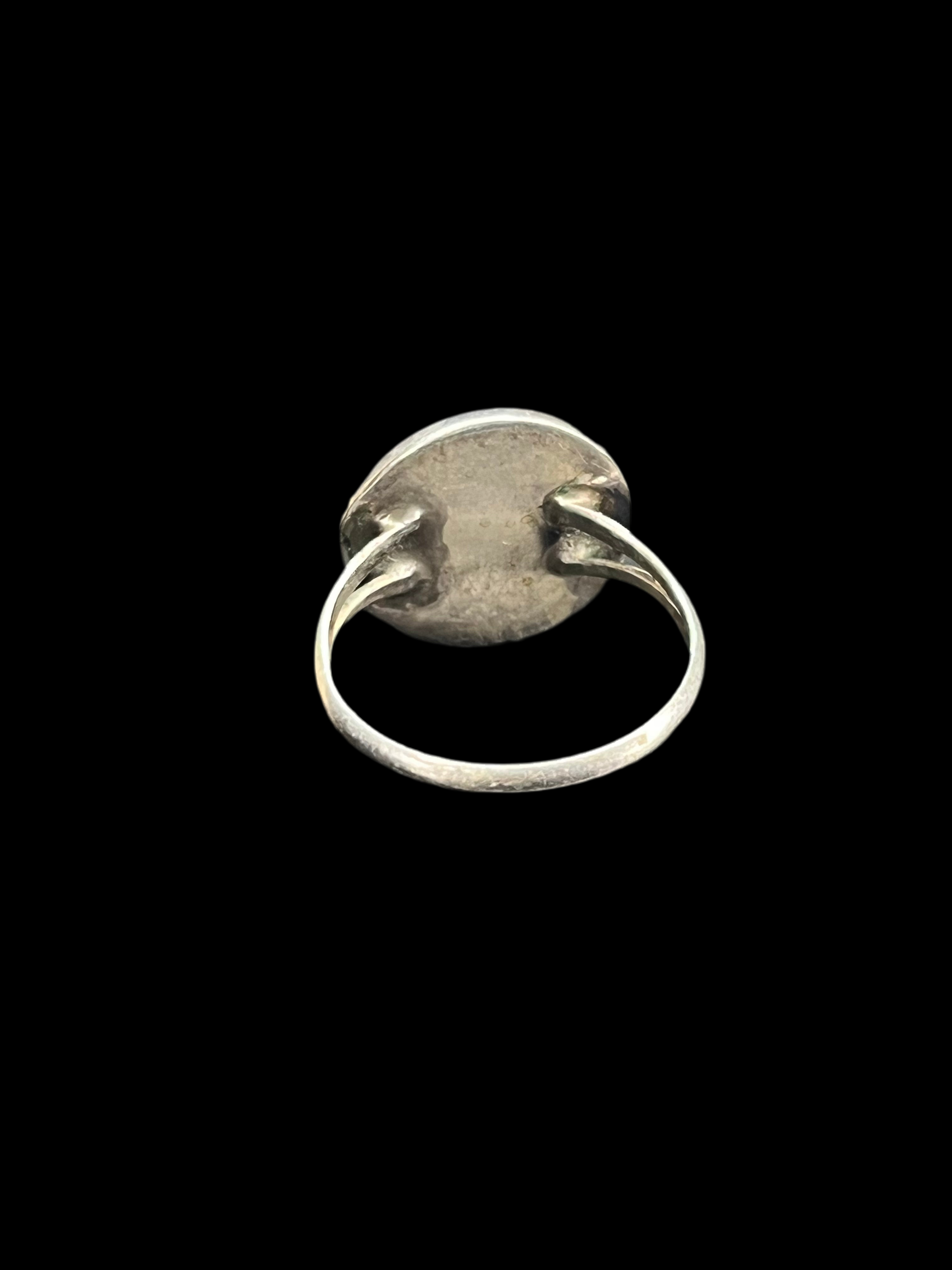 Elevate your jewelry collection with this stunning Antique Malachite Ring. Crafted with genuine malachite and set in a sterling silver shadow box, this ring is estimated to be over 65 years old. Beautiful and unique, it's sure to make a statement and add a touch of vintage charm to any outfit. Available in size 8.