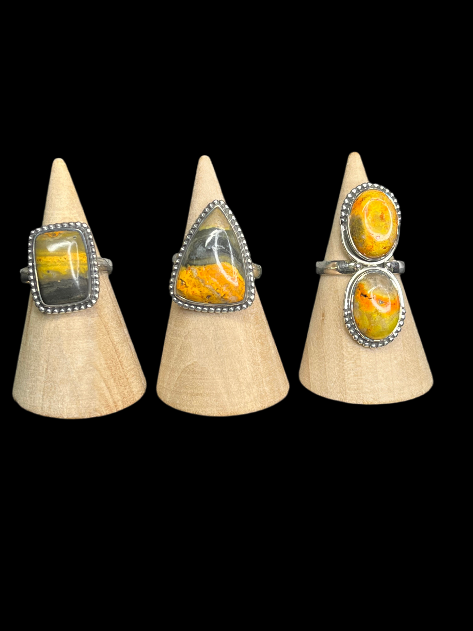 Get ready to stand out with our Bumblebee Jasper Sterling Silver Rings! Mined by hand near the Papandayan volcano in West Java, Indonesia, this unique gemstone is worth the effort. With its striking yellow and black patterns, each ring is one-of-a-kind. Available in various sizes and set in sterling silver.