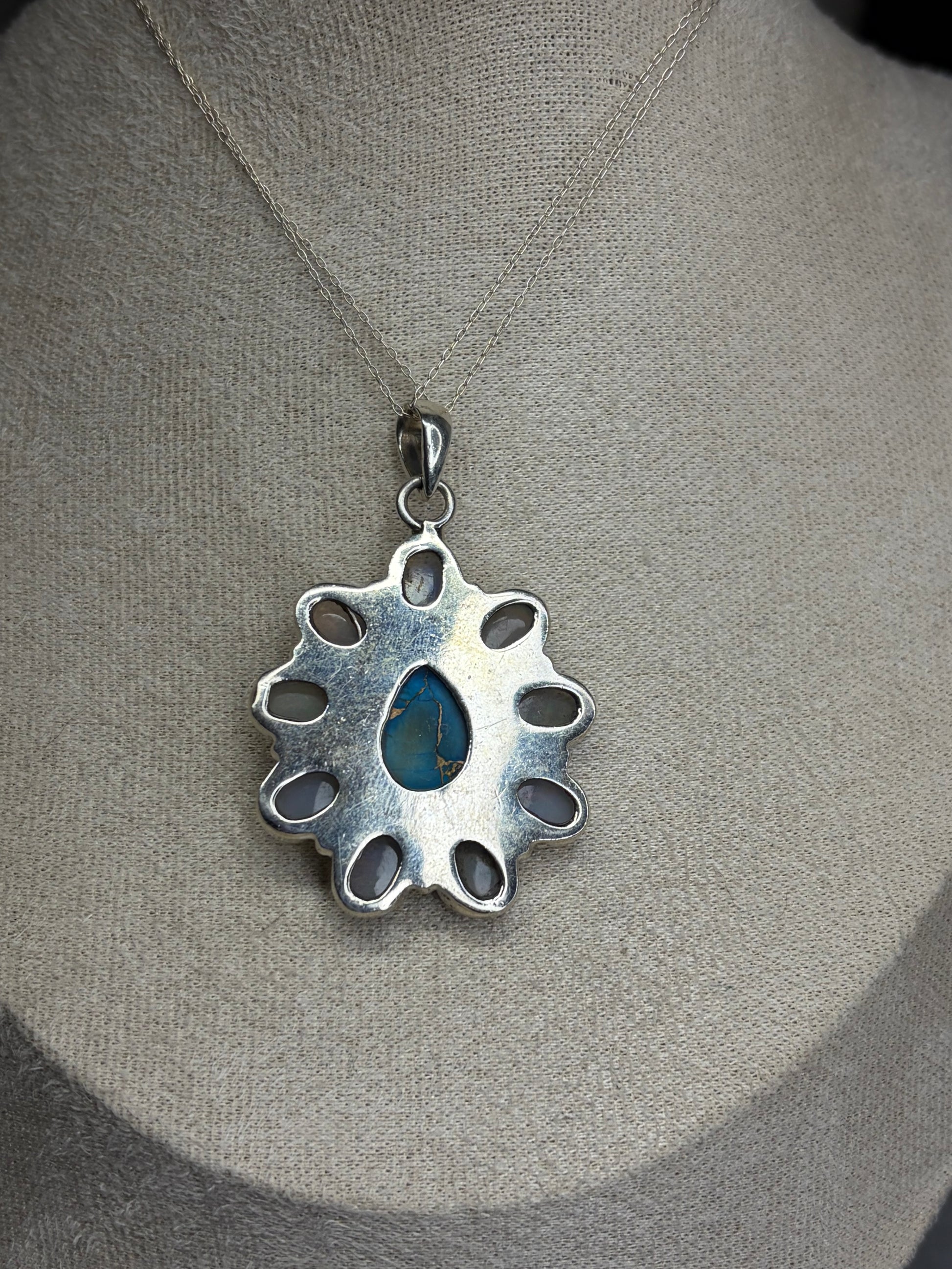 Discover the unique beauty of this Ethiopian Fire Opal & Copper Turquoise Statement Pendant. With 9 genuine Ethiopian fire opal pieces surrounding a blue copper turquoise center, this pendant showcases an open back and is crafted from high-quality sterling silver. Add a touch of elegance to any outfit with this stunning one-of-a-kind piece.