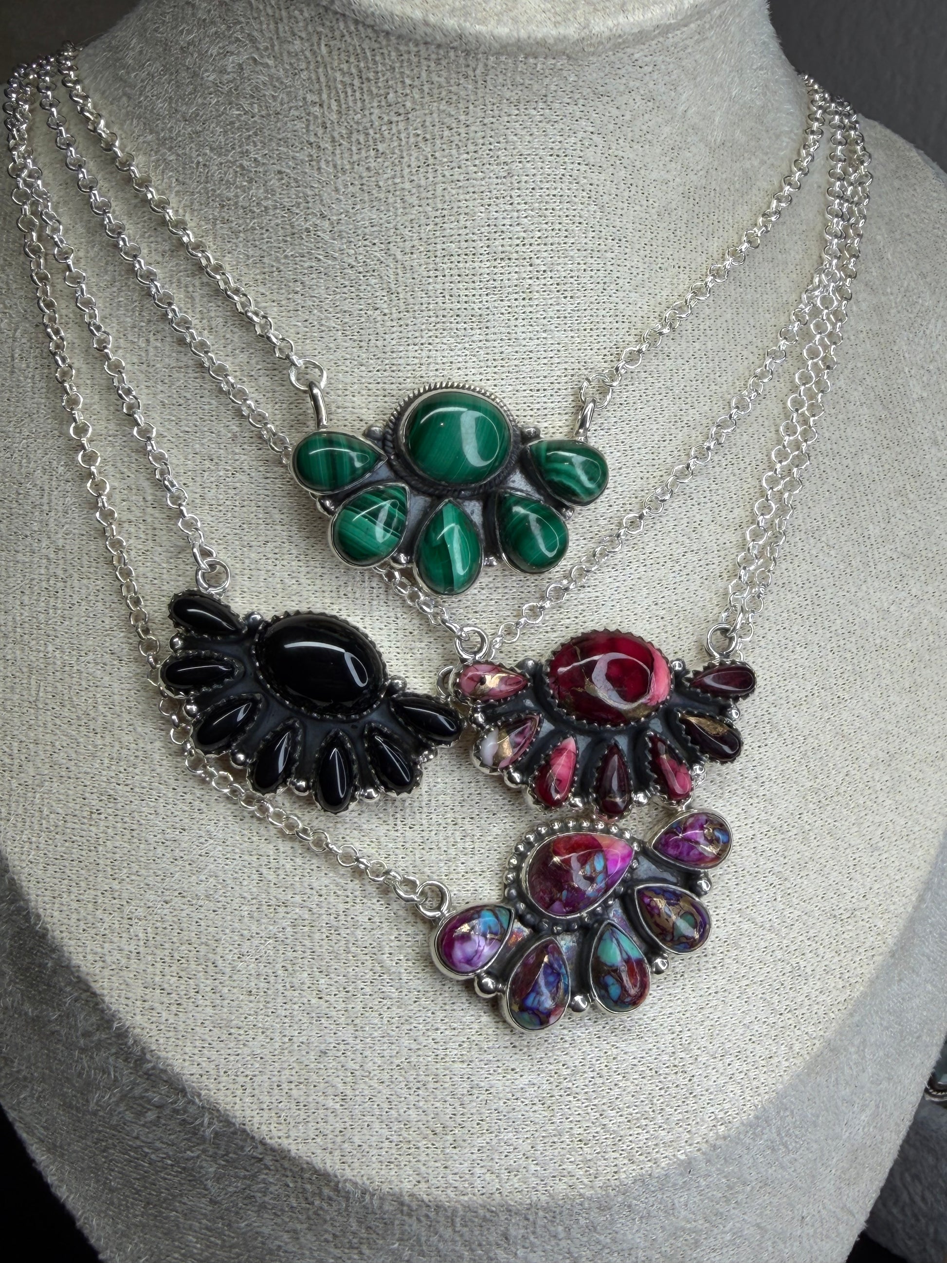 This stunning statement necklace is available in four beautiful gemstone options - Malachite, Black Onyx, Red Dahlia, and Pink Dahlia. Made with sterling silver and featuring a closed back design, this necklace is the perfect addition to any outfit. With an adjustable length of 17 to 19 inches, it is sure to be a versatile and stylish piece for any occasion. Add a touch of elegance and sophistication to your wardrobe with this Half Cluster Statement Necklace!
