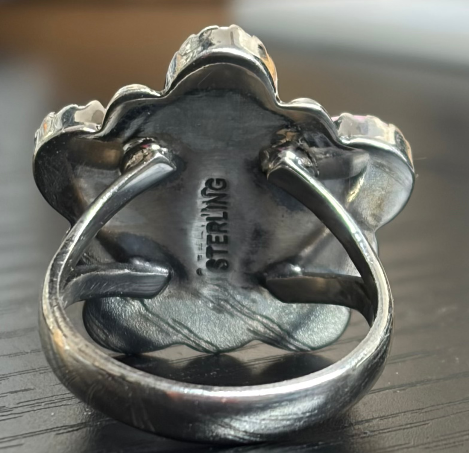 Indulge in the beauty of our Handcrafted Pink Conch & Kingman Turquoise Cluster Ring! Made by skilled artisans, this sterling silver ring features a split shank design and closed back for a comfortable fit. Adorned with genuine conch shell and natural Kingman turquoise, it's a unique and eye-catching addition to any outfit.