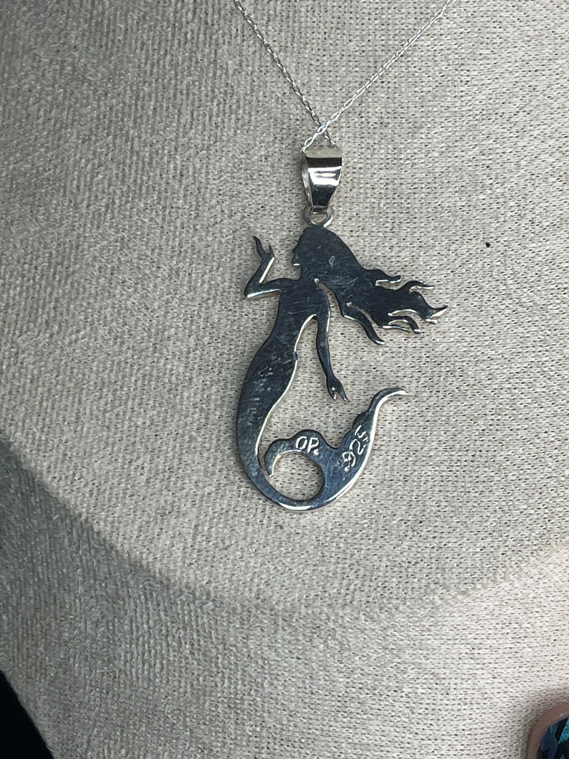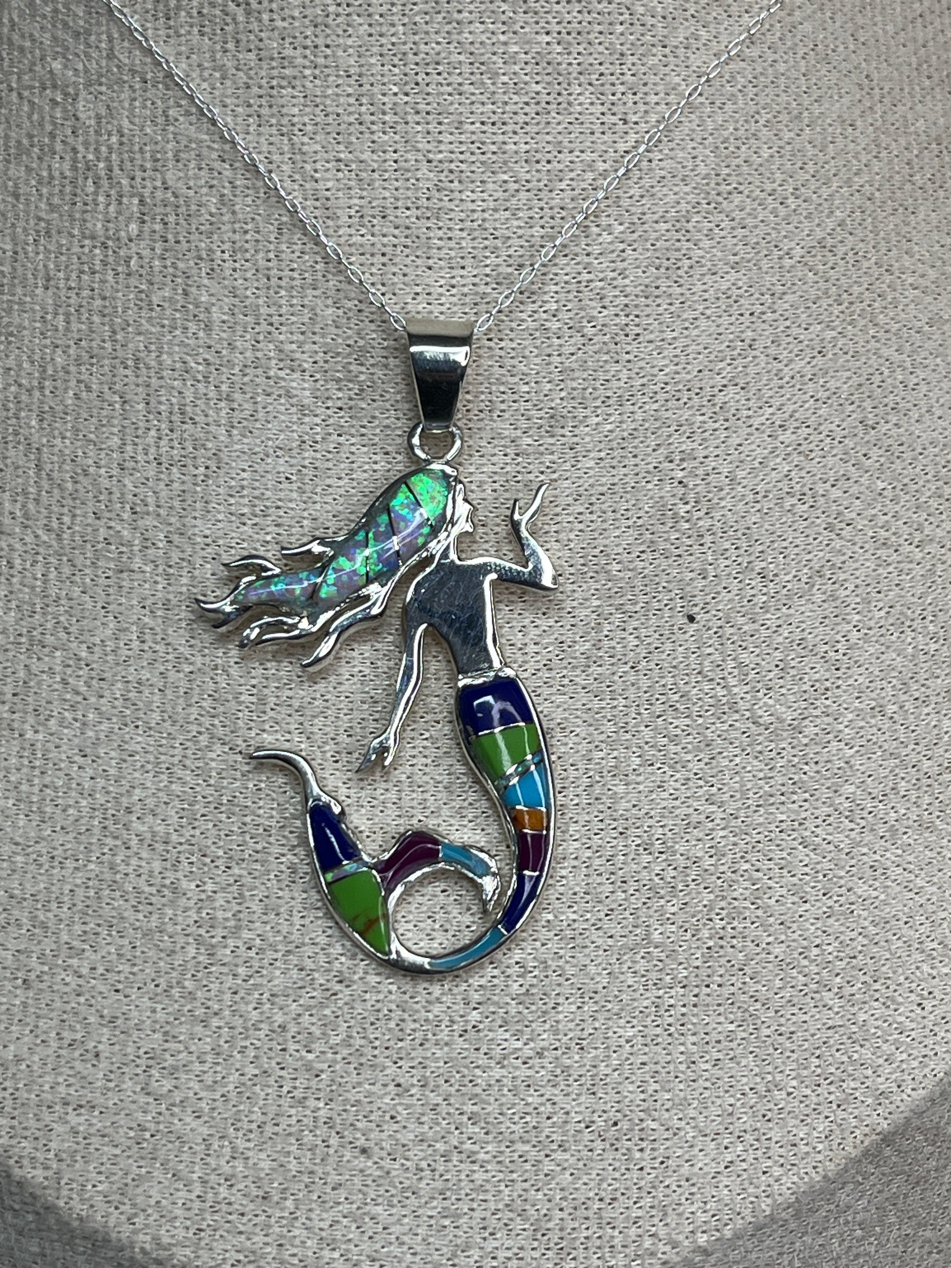 Embrace the beauty of the ocean with our Inlay Mermaid Pendant! This stunning pendant features a range of natural stones, including lab opal, lapis lazuli, and turquoise, expertly crafted into a unique design by native artist, Offina Pino. Measuring just shy of 2 inches with the bale, this pendant is a must-have for any jewelry lover. Signed for authenticity. Dive in now!