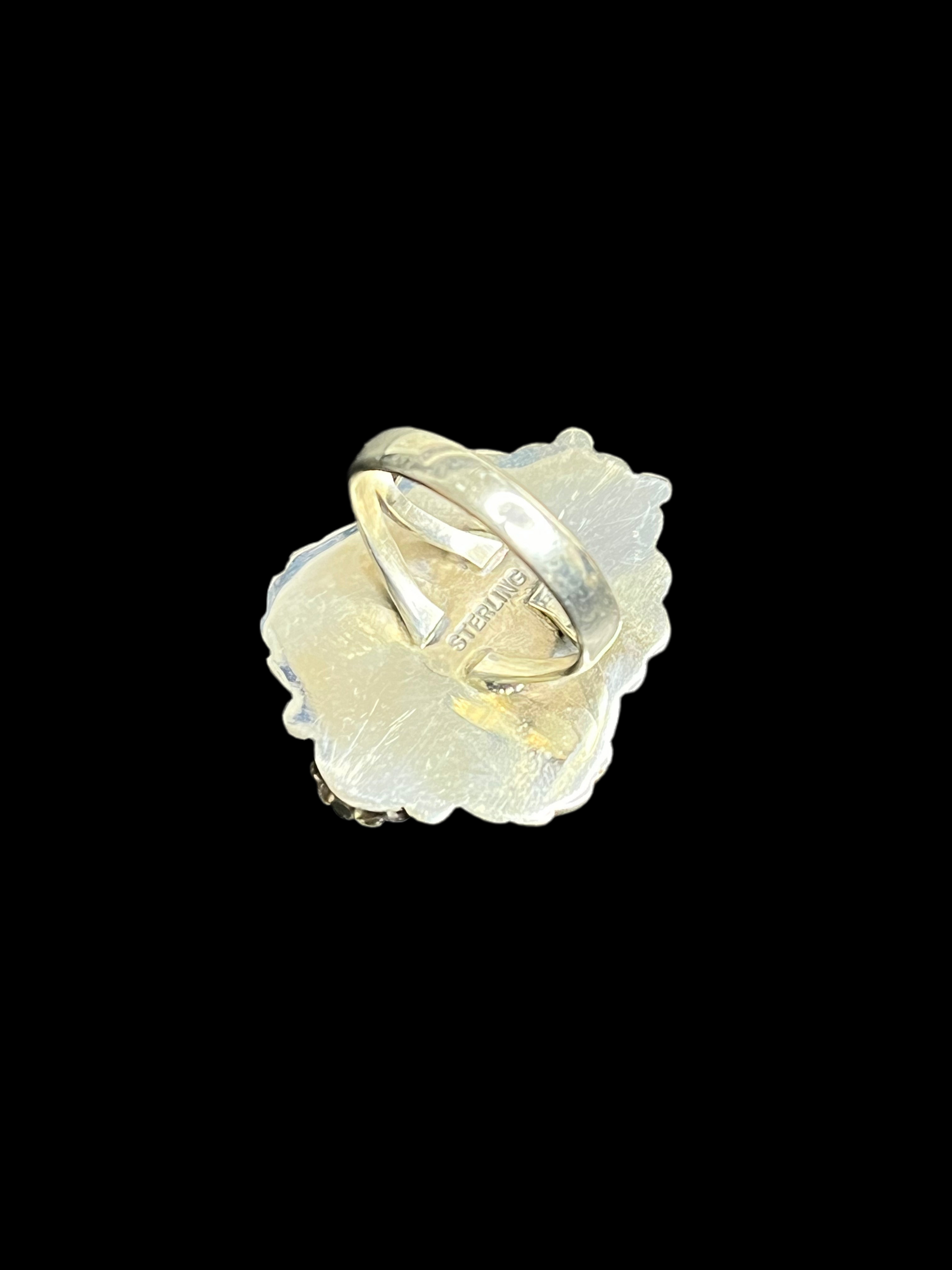 Handcrafted with intricate detail, this Kingman Turquoise Sterling Silver Heart Ring in size 7.5 is a one-of-a-kind piece. The closed back design ensures durability while the inclusion of quartz and pyrite in the stone adds a unique flair. Feel confident and stylish with this handmade ring.