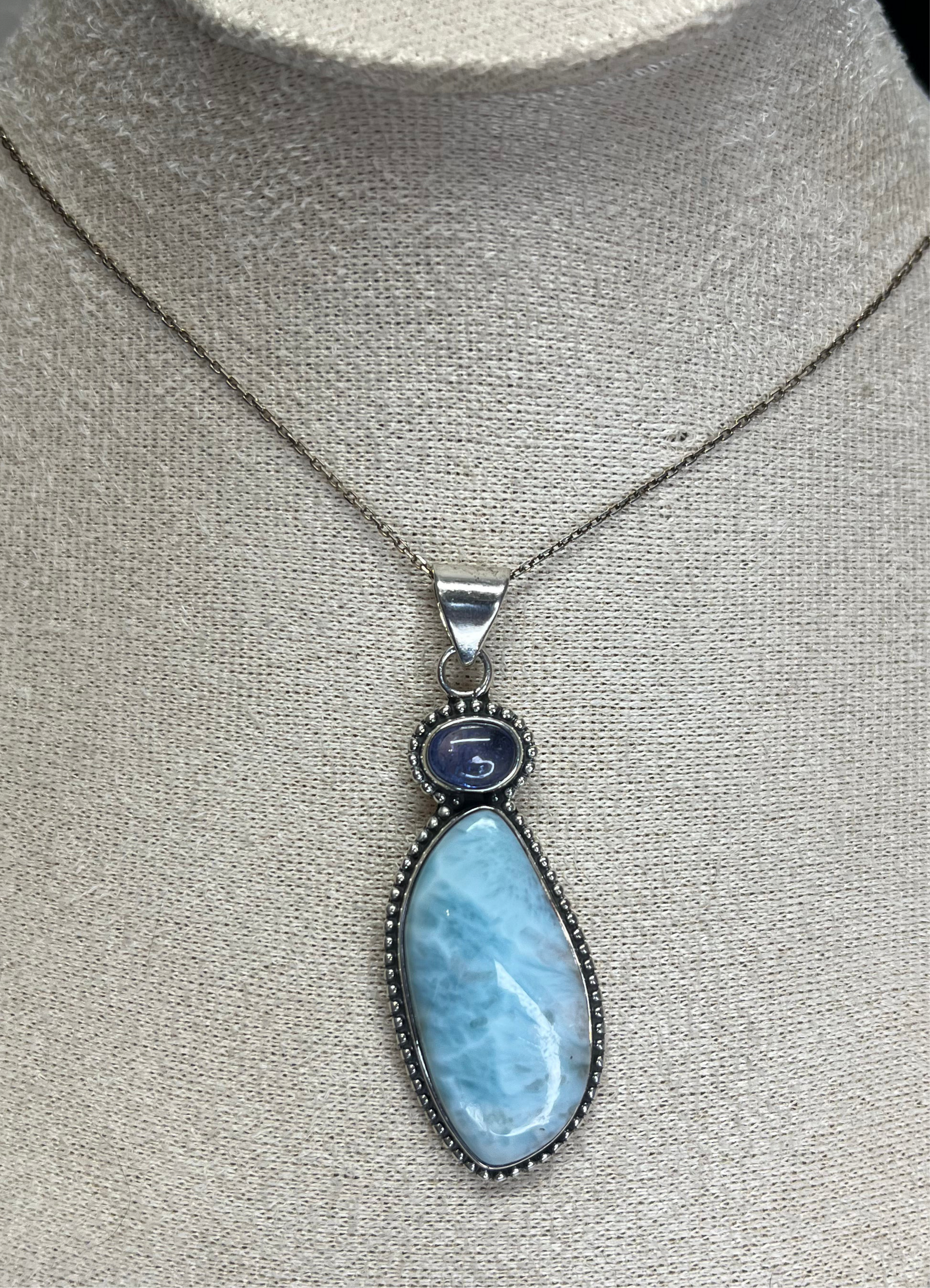 Elevate your style with our stunning Larimar Pendants. Each crafted with care, these statement pieces feature a unique combination of rare Larimar and sparkling tanzanite, set in sterling silver. Hurry, as Larimar is no longer being mined, making these pendants a truly one-of-a-kind treasure.