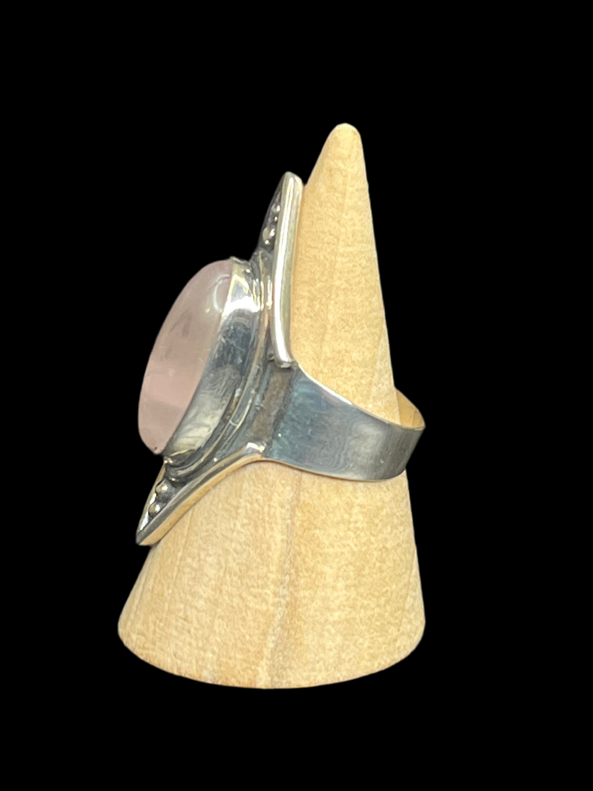 Experience the radiance of natural rose quartz with our Rose Quartz Sterling Silver Ring. Its open back design allows for comfortable wear while making a statement. Adorn your finger with this size 9 ring and add a touch of understated elegance and positive energy to your outfit!