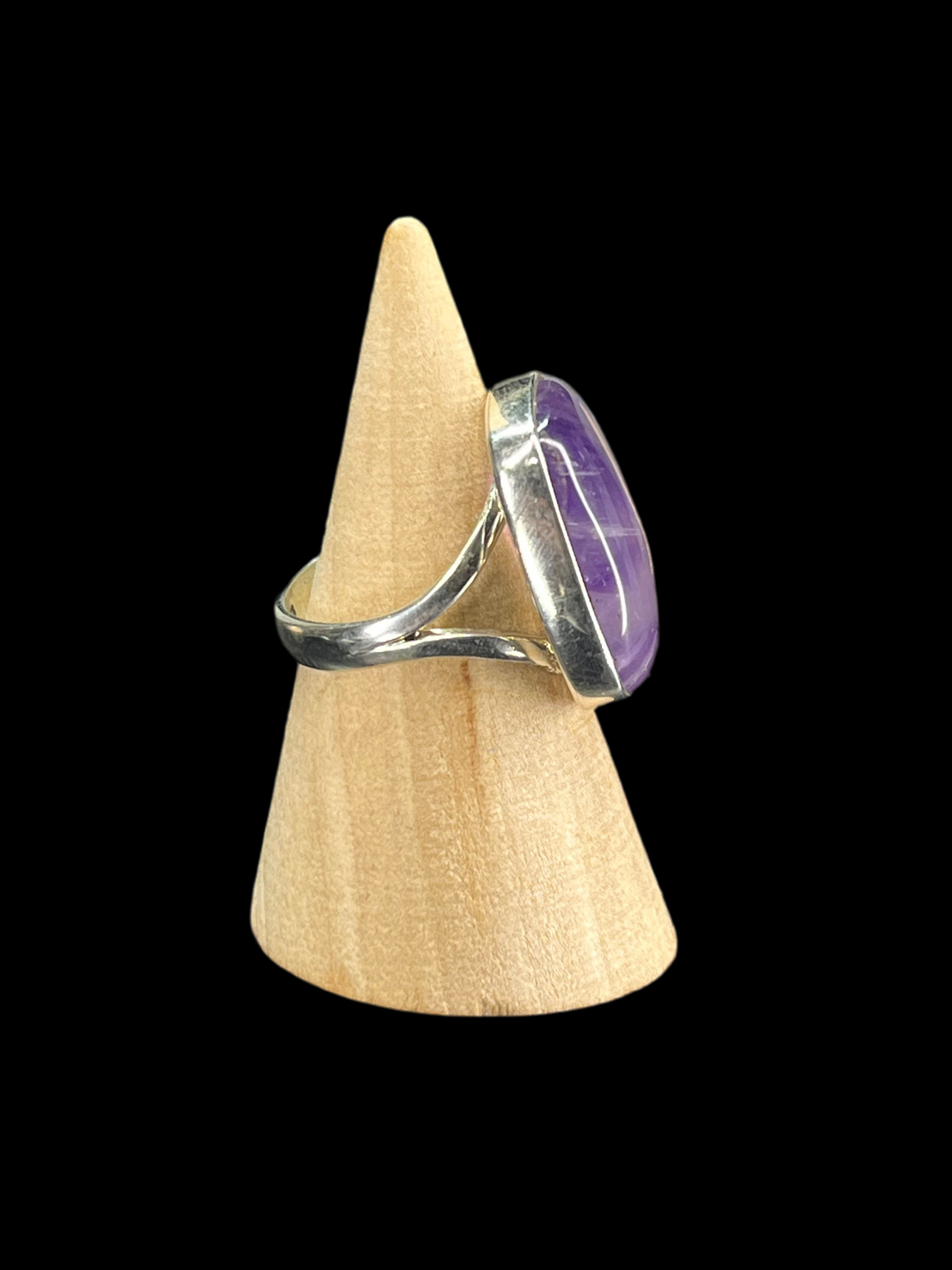 Unleash the power of Super 7 with this stunning amethyst ring in size 7. Harnessing the energies of seven minerals, including amethyst and quartz, this ring brings clarity, protection, and abundance. Crafted in sterling silver with a bezel set and split shank design, it's a unique piece that will elevate any outfit.