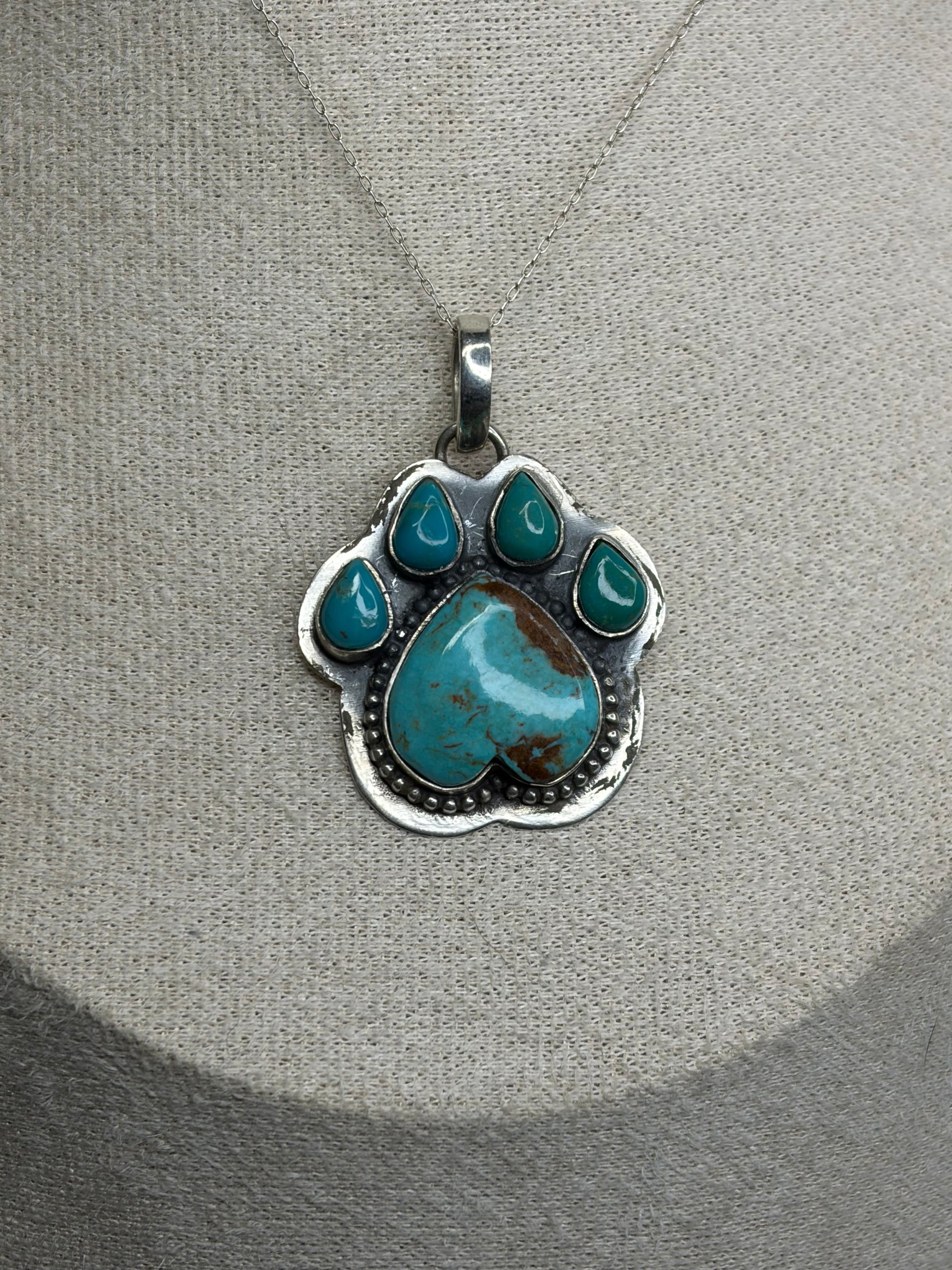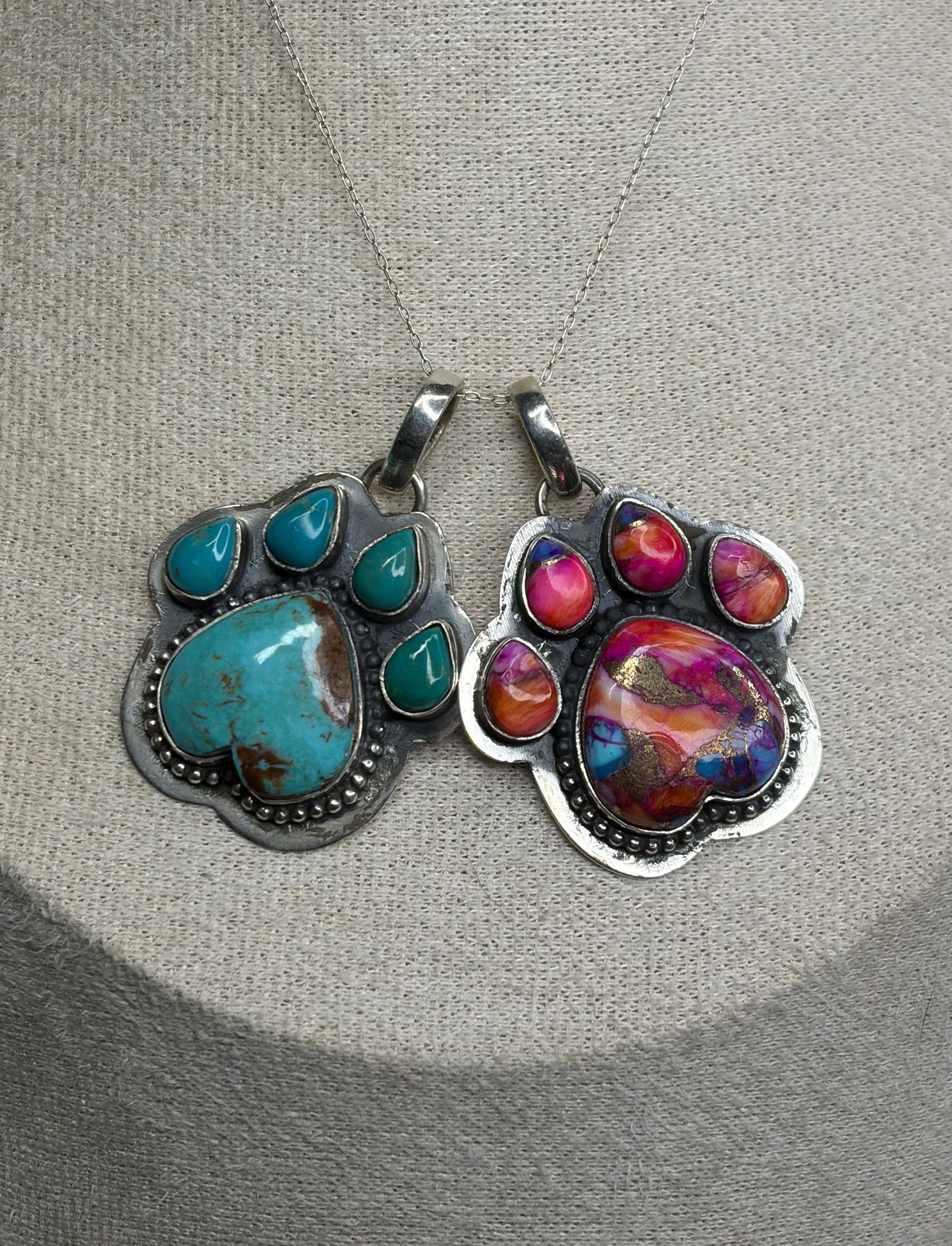Unleash your unique style with The Paw Pendant! Choose from two stunning options, Kingman Turquoise or Pink Dahlia, both set in sterling silver with intricate Southwestern detailing. The closed back design ensures durability, making this pendant the perfect embodiment of elegance and strength.