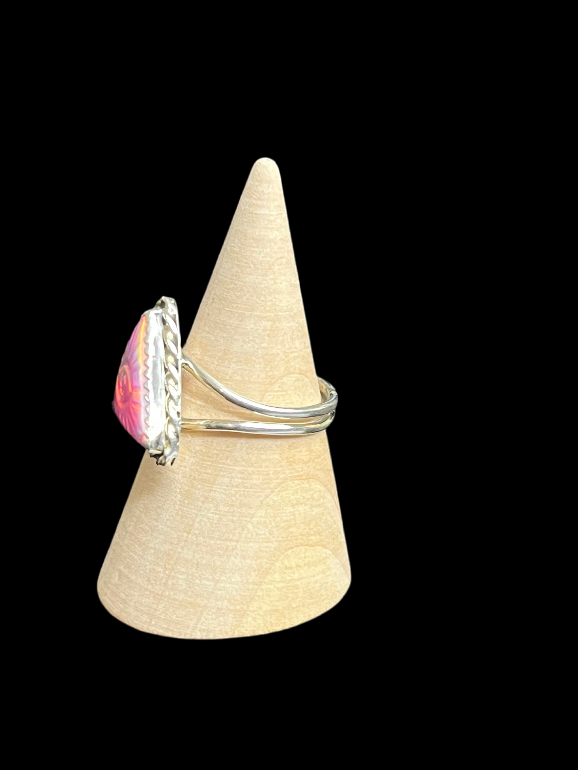 This sterling silver ring features a man made Aurora opal with a gorgeous color shift that will catch anyone's eye. With the eye of providence design, this ring is not only stunning but also carries a powerful symbol of protection. Available in size 8.