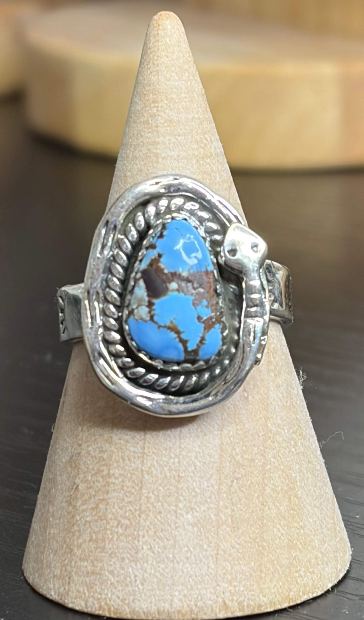 Add a touch of elegance to your style with our Golden Hills Turquoise Ring. Crafted with sterling silver and a stunning closed back design, this adjustable ring features a delicate snake detail for a unique and timeless look. Perfect for any occasion, this ring is a must-have for any jewelry collection.