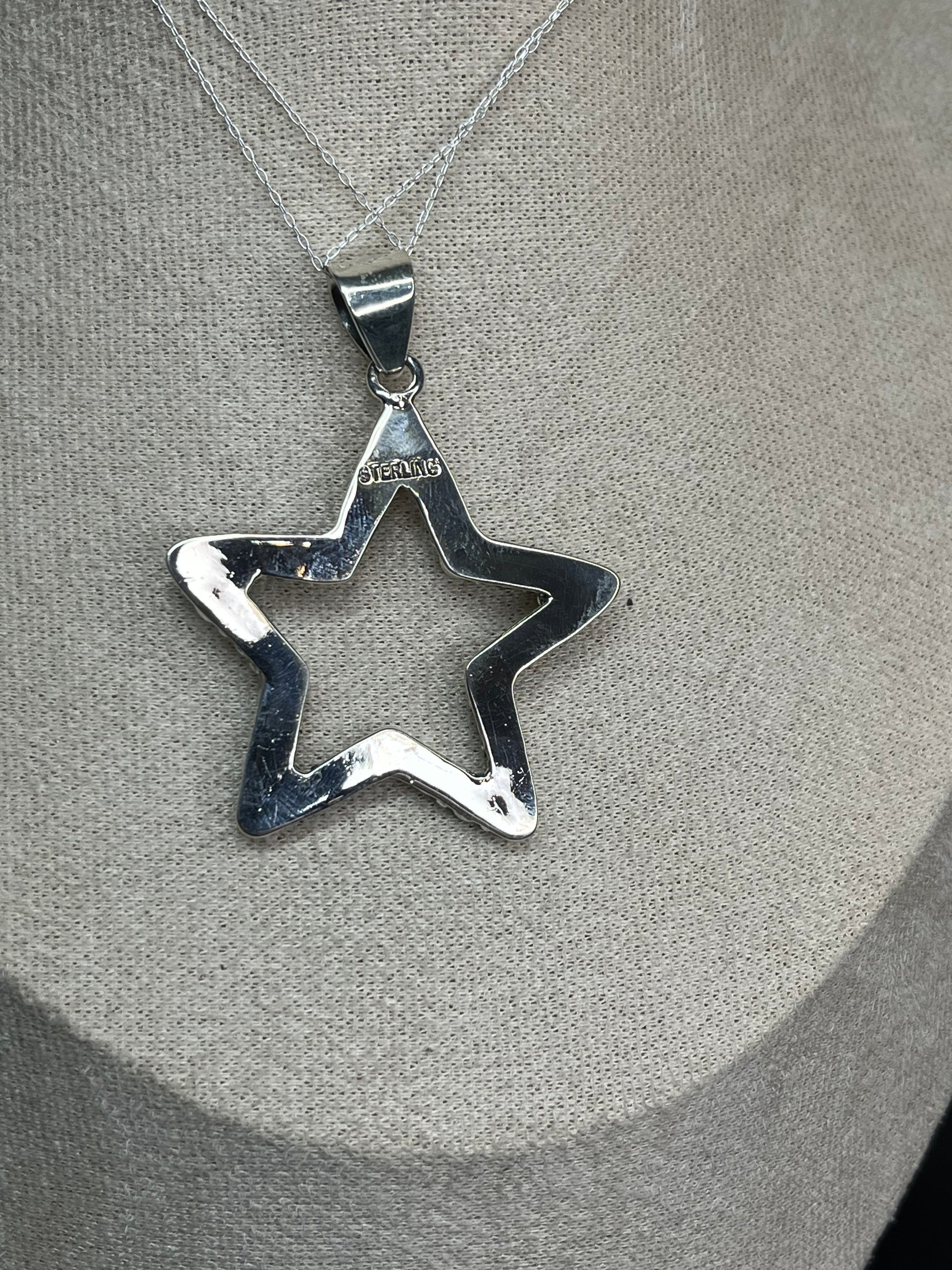 Elevate your style with our Kingman Turquoise Star Pendant. Handcrafted with genuine micro-stones set in sterling silver and boasting a detailed bale, this statement piece will surely catch the eye. Negative space in the center adds a touch of unique charm. Over 2 inches long, it's the perfect addition to any outfit.