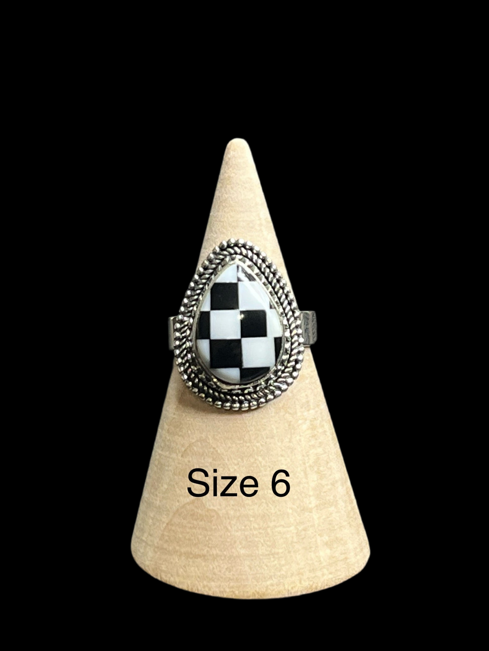Elevate your style with our Black Onyx Checker Sterling Silver Rings. The pear/teardrop shape and thick band add a touch of elegance, while the open back allows for adjustability. Crafted from sterling silver, these rings are perfect for adding a touch of Southwestern flair to any outfit. Available in sizes 6-10.